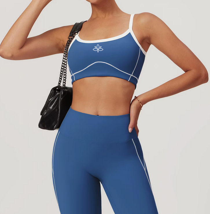 Flattering sports bra with white piping details.